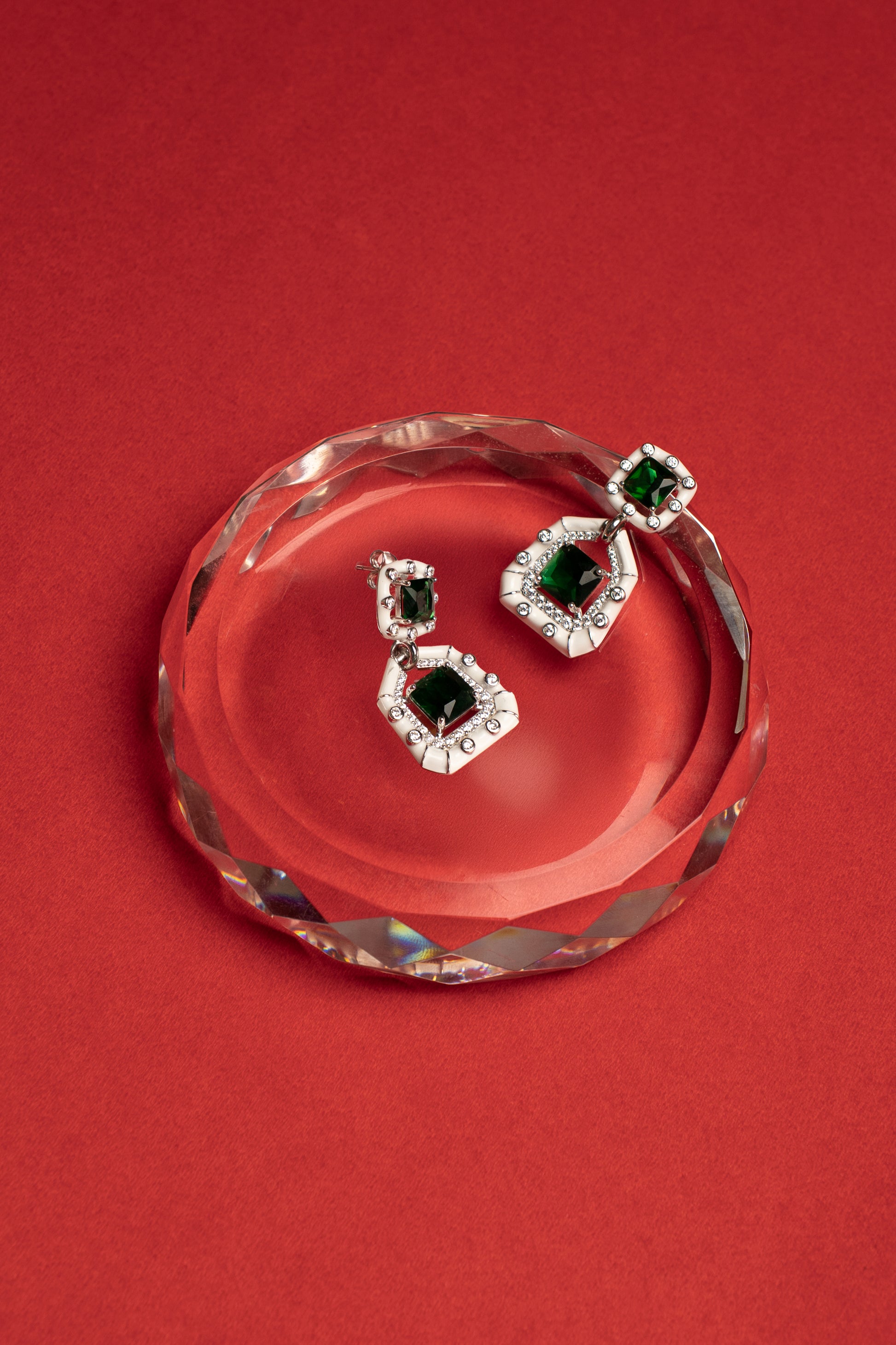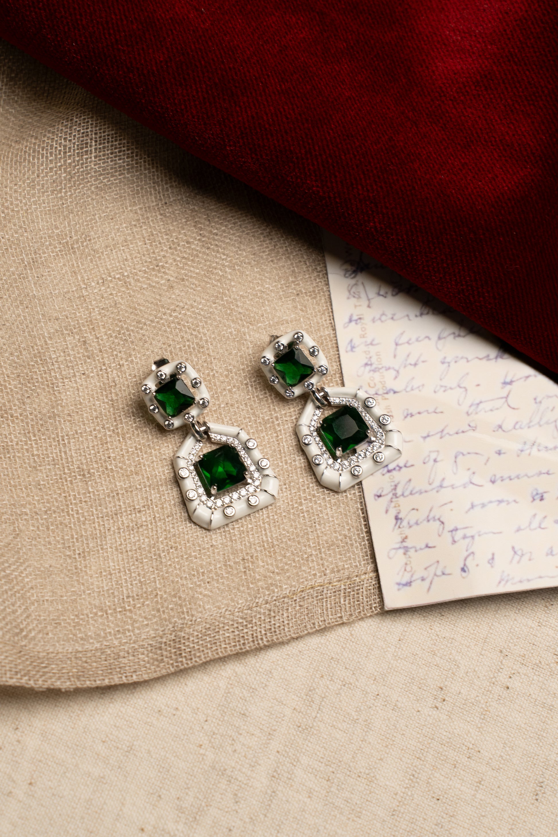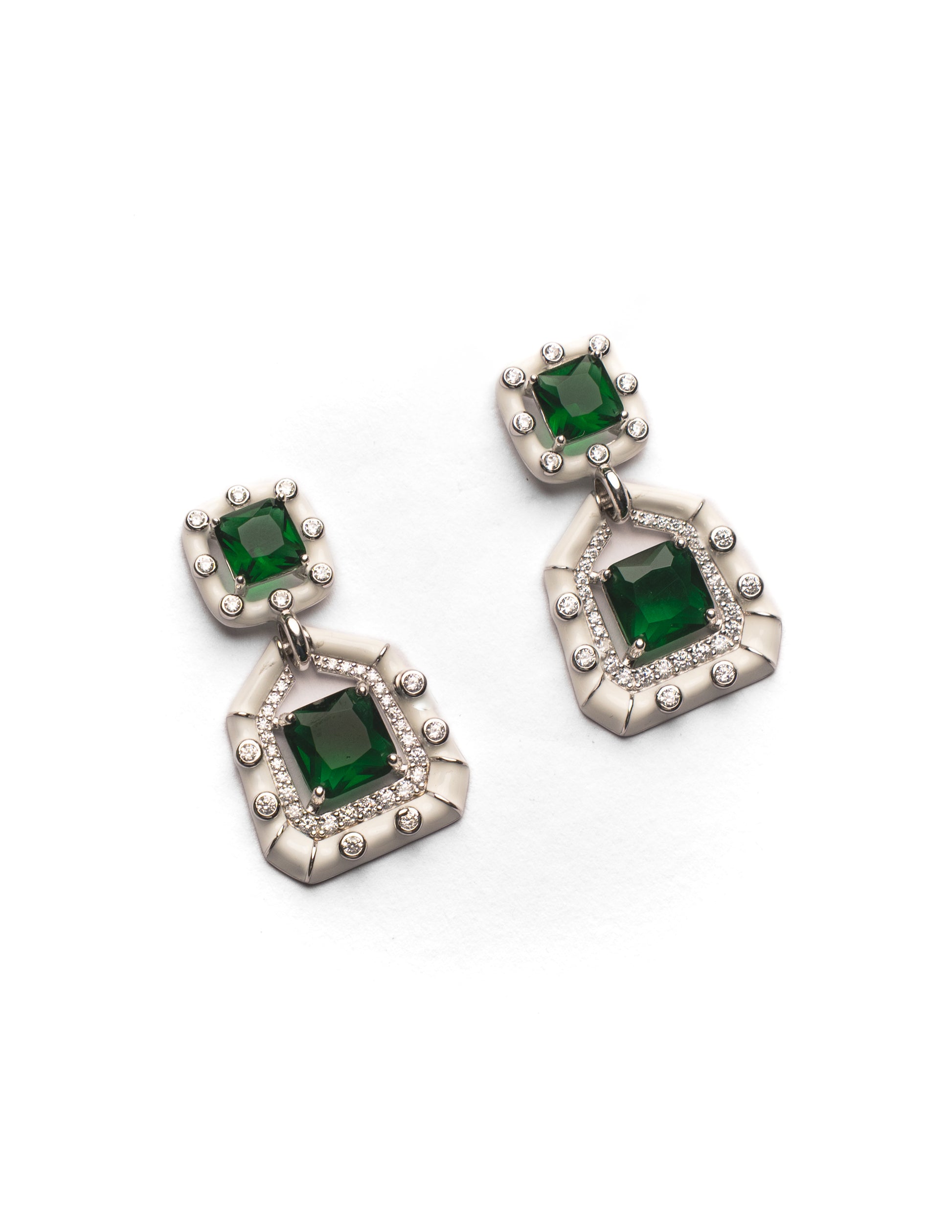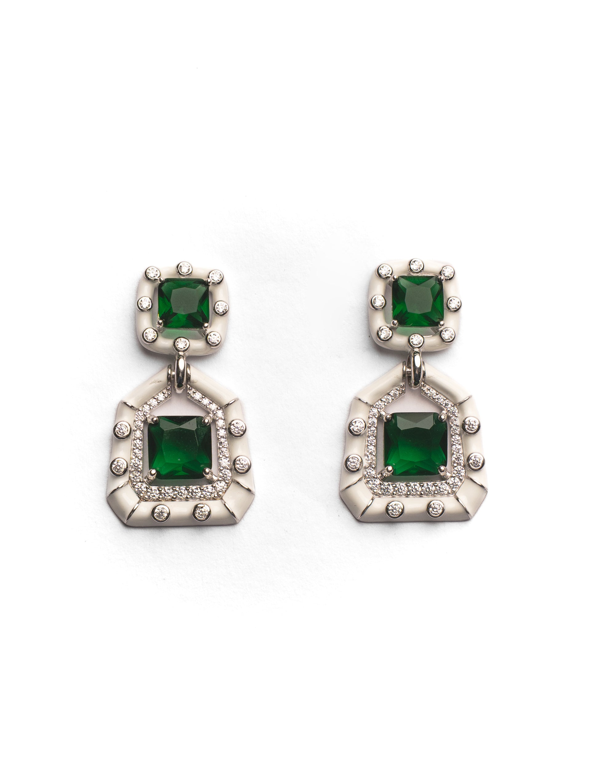 Bold green gemstones set in silver enamel frames. Bold elegance with festive color.