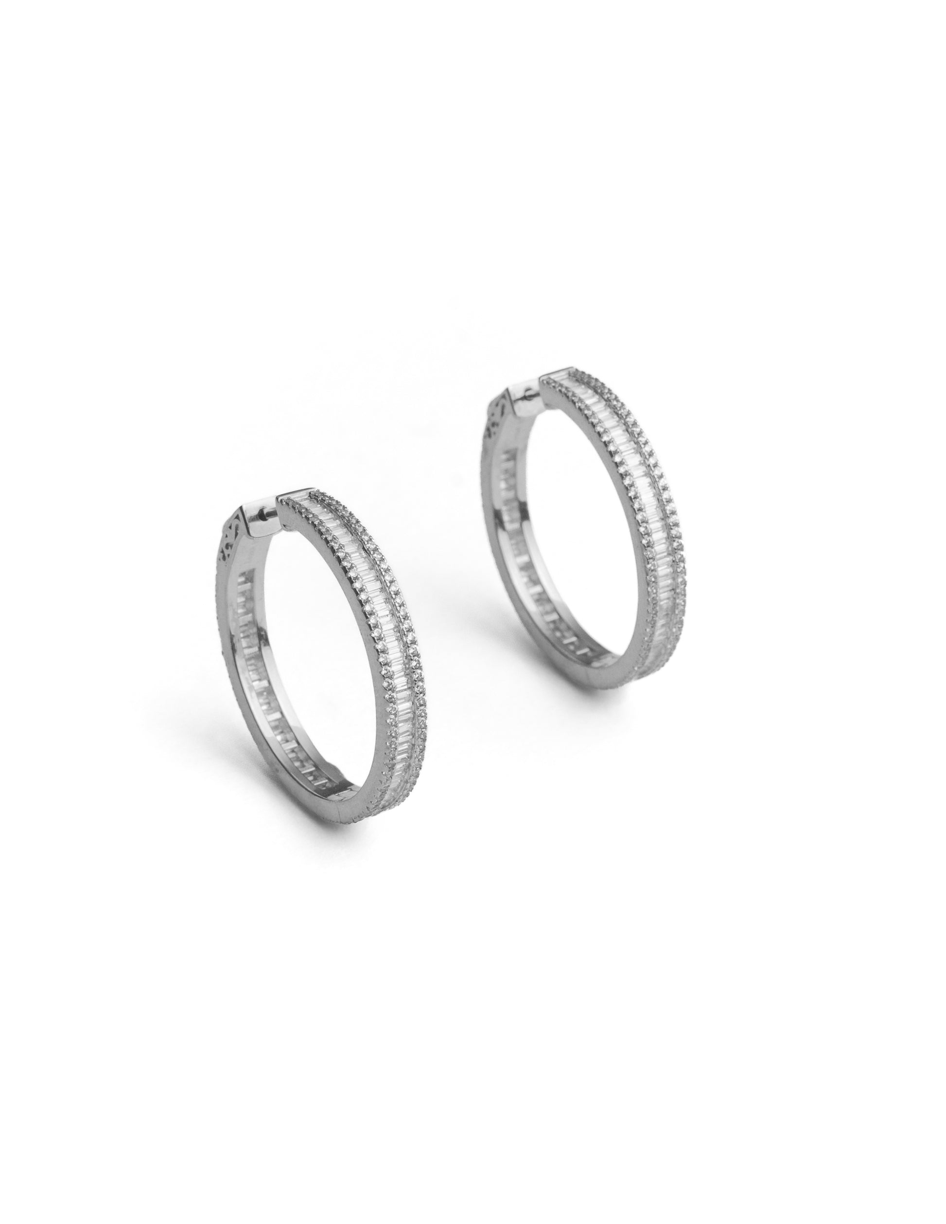 A sleek pair of silver hoops lined with fine baguette zircons. Their clean geometry and icy shimmer make them perfect for elevating everyday looks with a winter-kissed elegance.