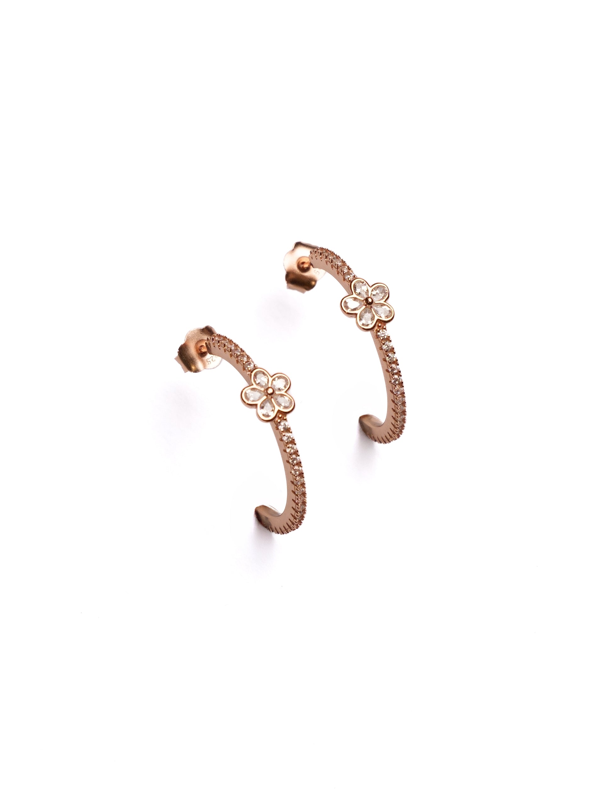 Graceful floral studs with climbing crystal curves in warm rose gold-plated silver. These earrings combine the charm of botanical design with contemporary edge.