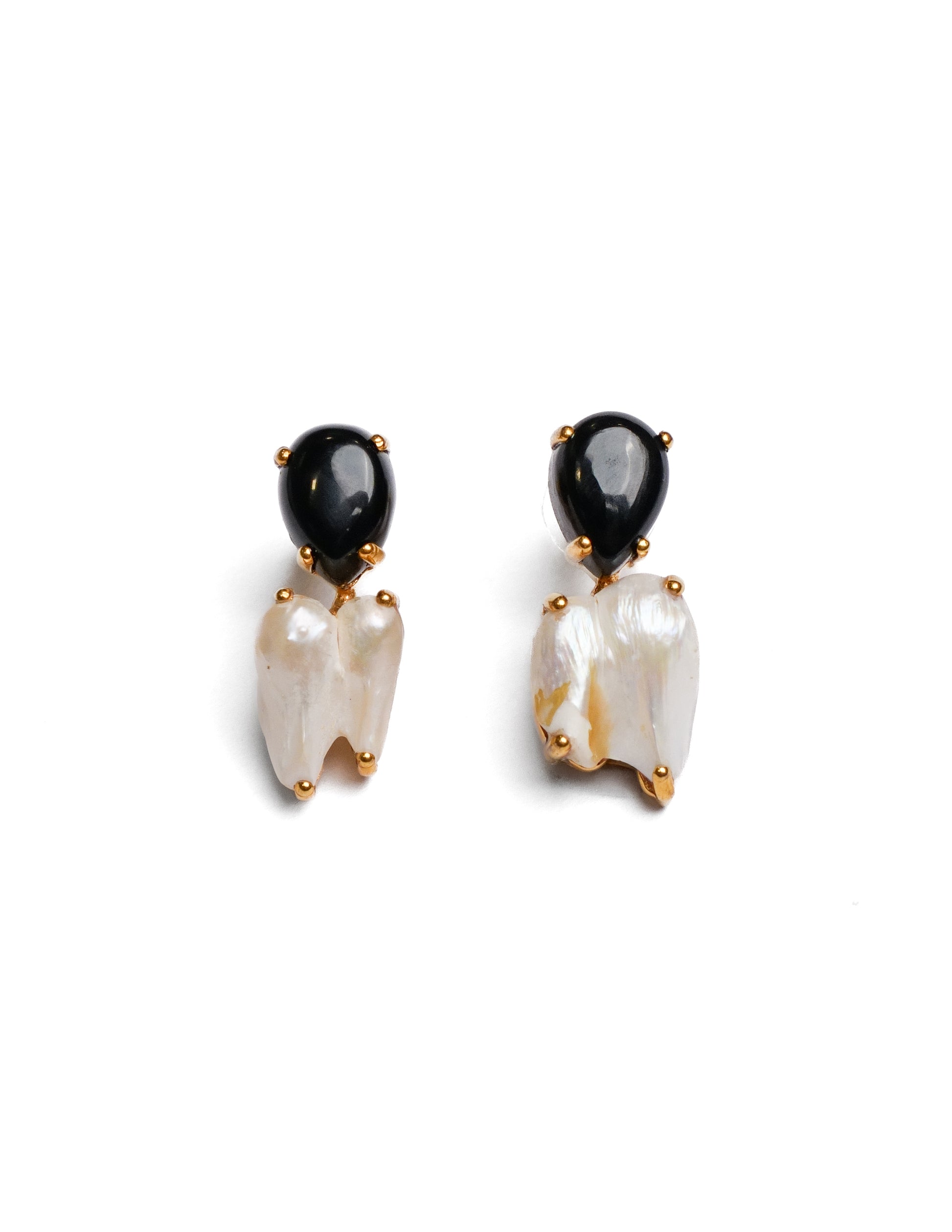 Dramatic two-stone drops pairing glossy black onyx with abstract pearl. The contrasting stones create striking visual impact.