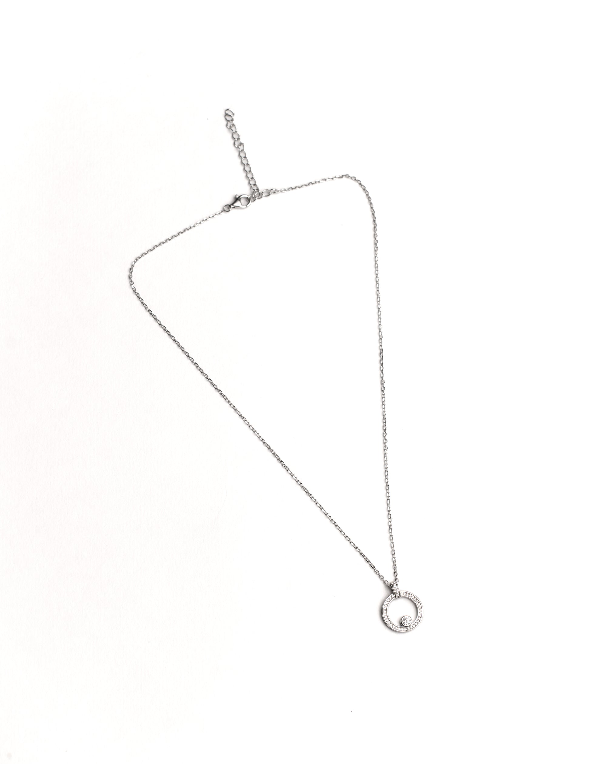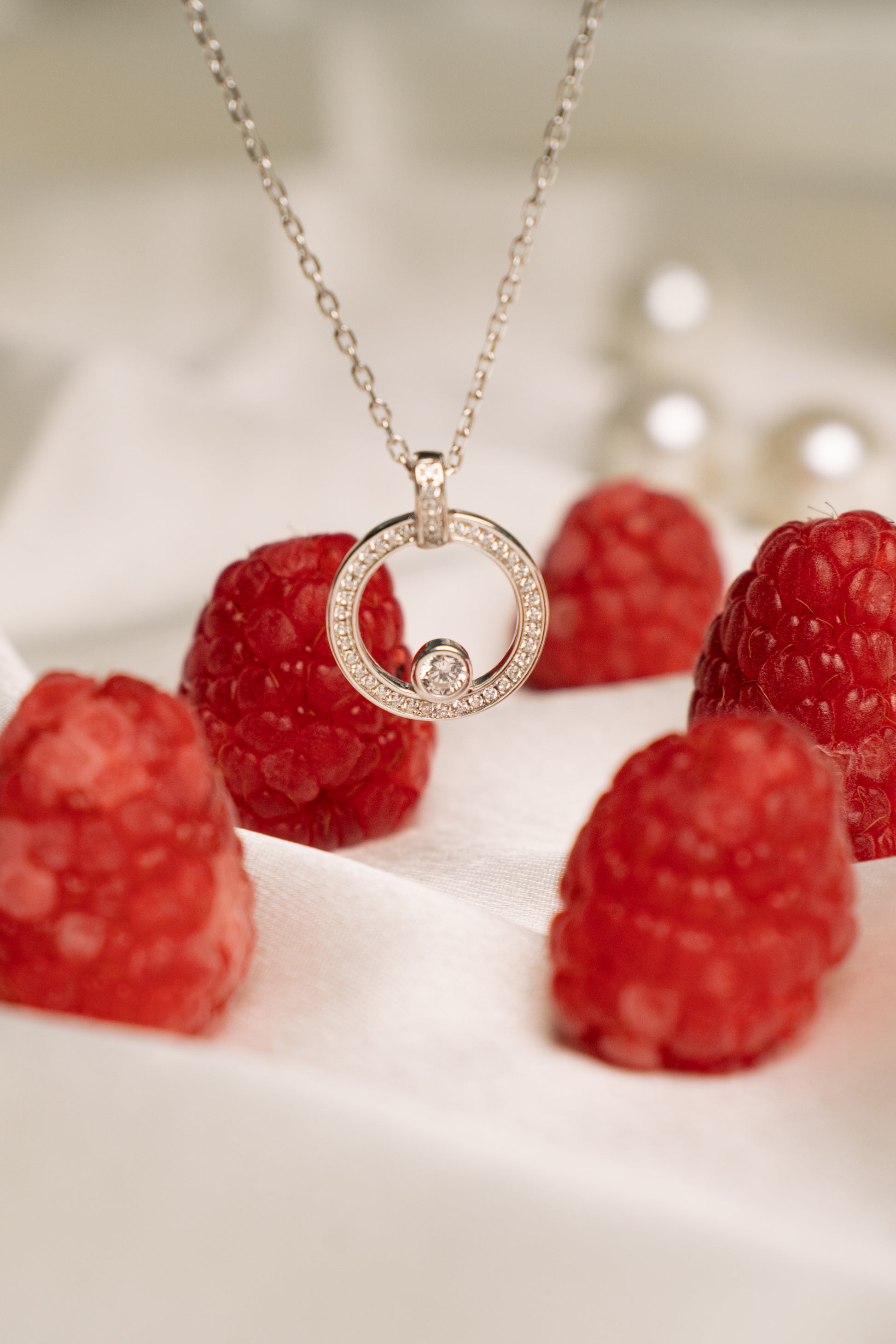 A circle of pavé-set zircons surrounding a single floating stone. Symbolizing warmth held within winter, this piece is minimal, balanced, and beautifully luminous.