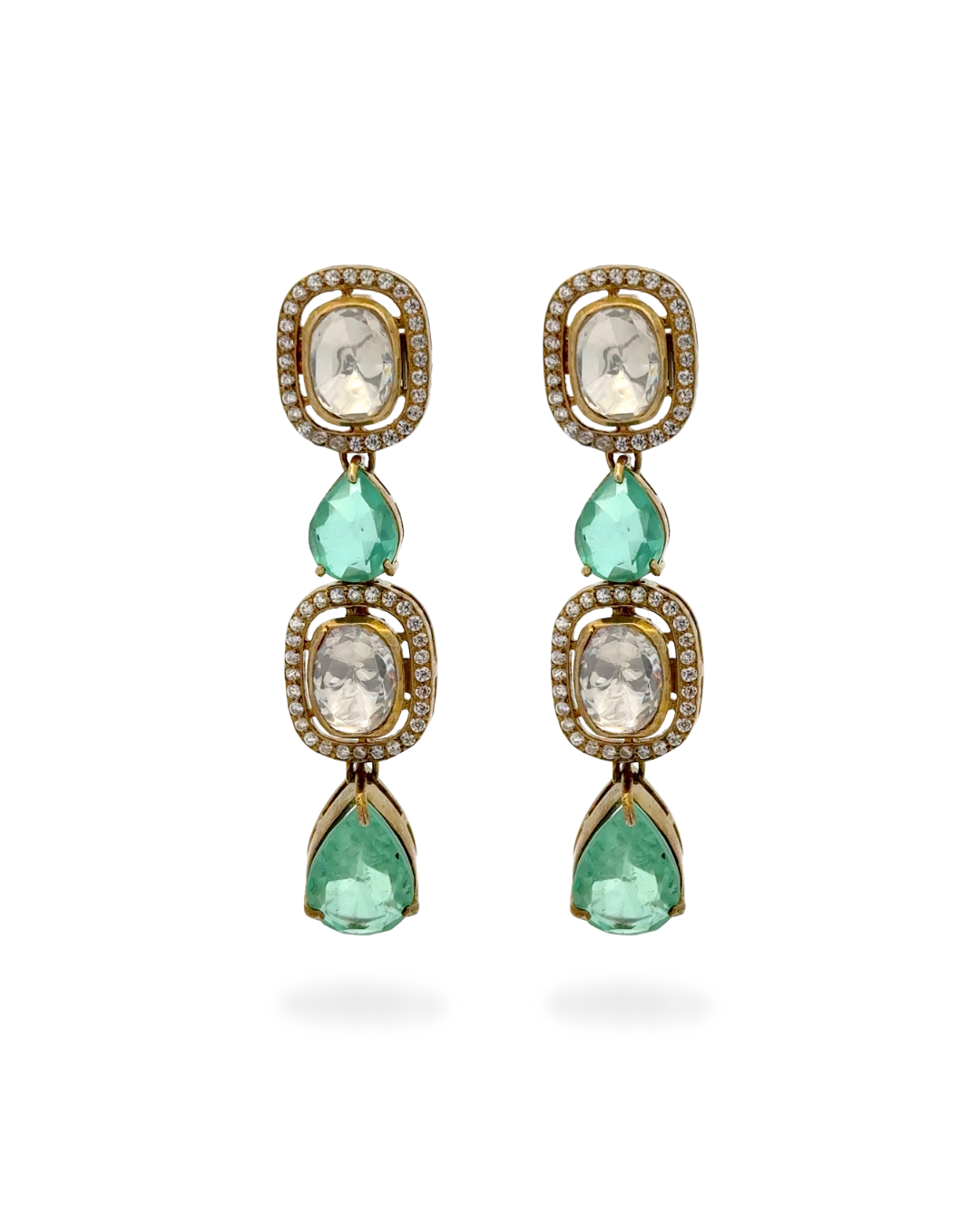 Isa green kundan polki and gemstone drop earrings, elegantly crafted to add festive sparkle for a chic Diwali soirée.
