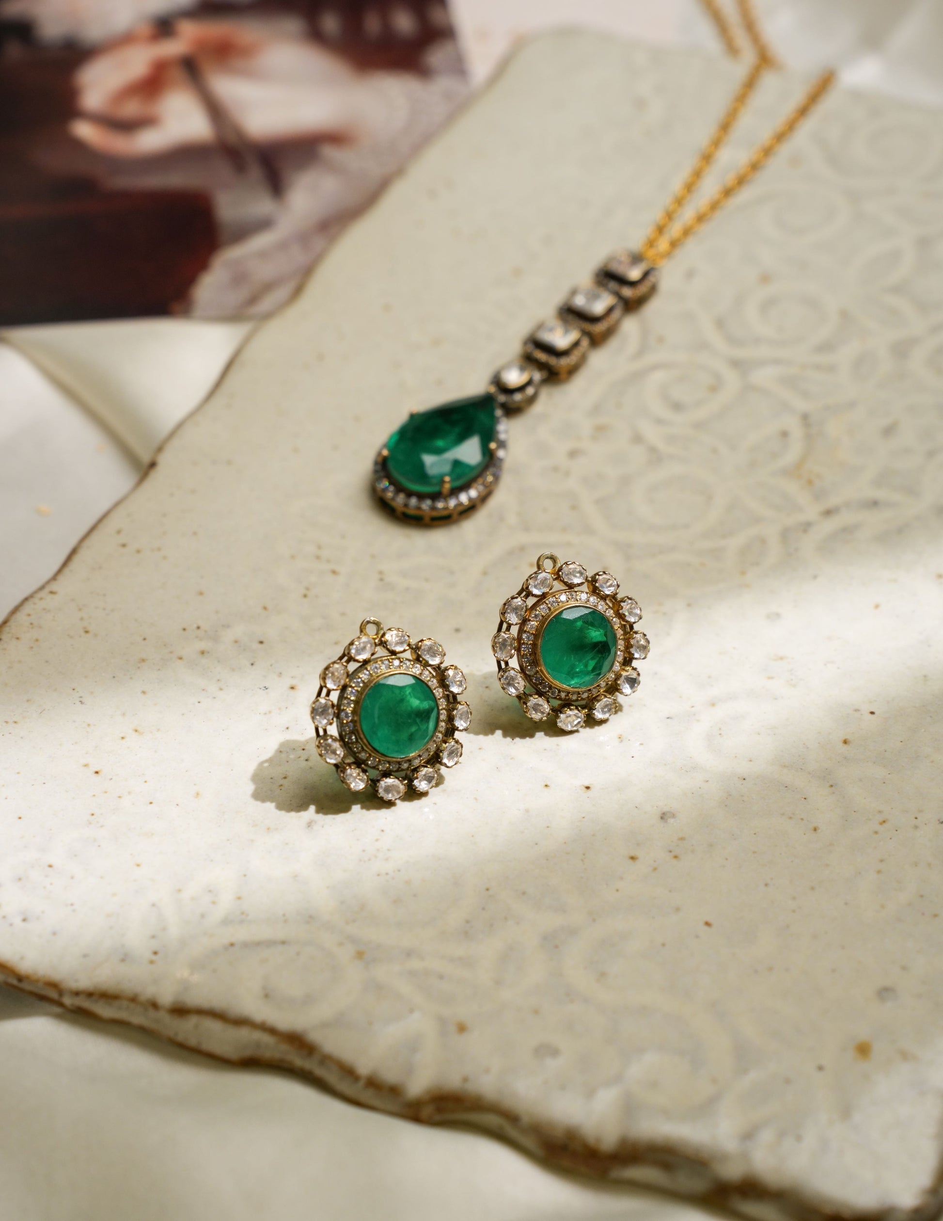 Rich gemstones surrounded by luminous kundan polki in a regal sunburst design. Handcrafted in silver, these earrings embody the opulence of English royal jewels with a contemporary spirit.