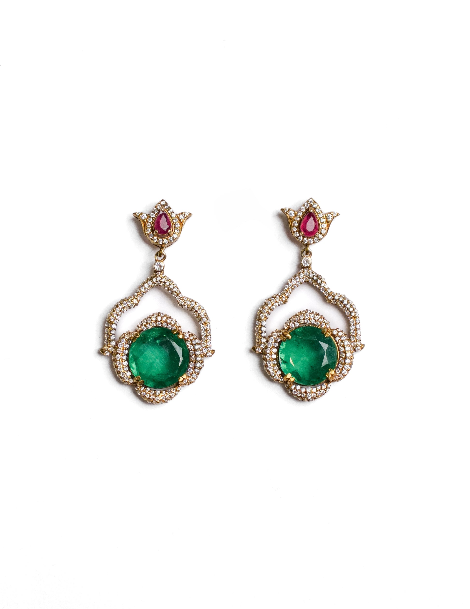 Opulent statement earrings showcasing gemstones embraced by elaborate cubic zirconia. For the woman who appreciates statement jewelry with soul.