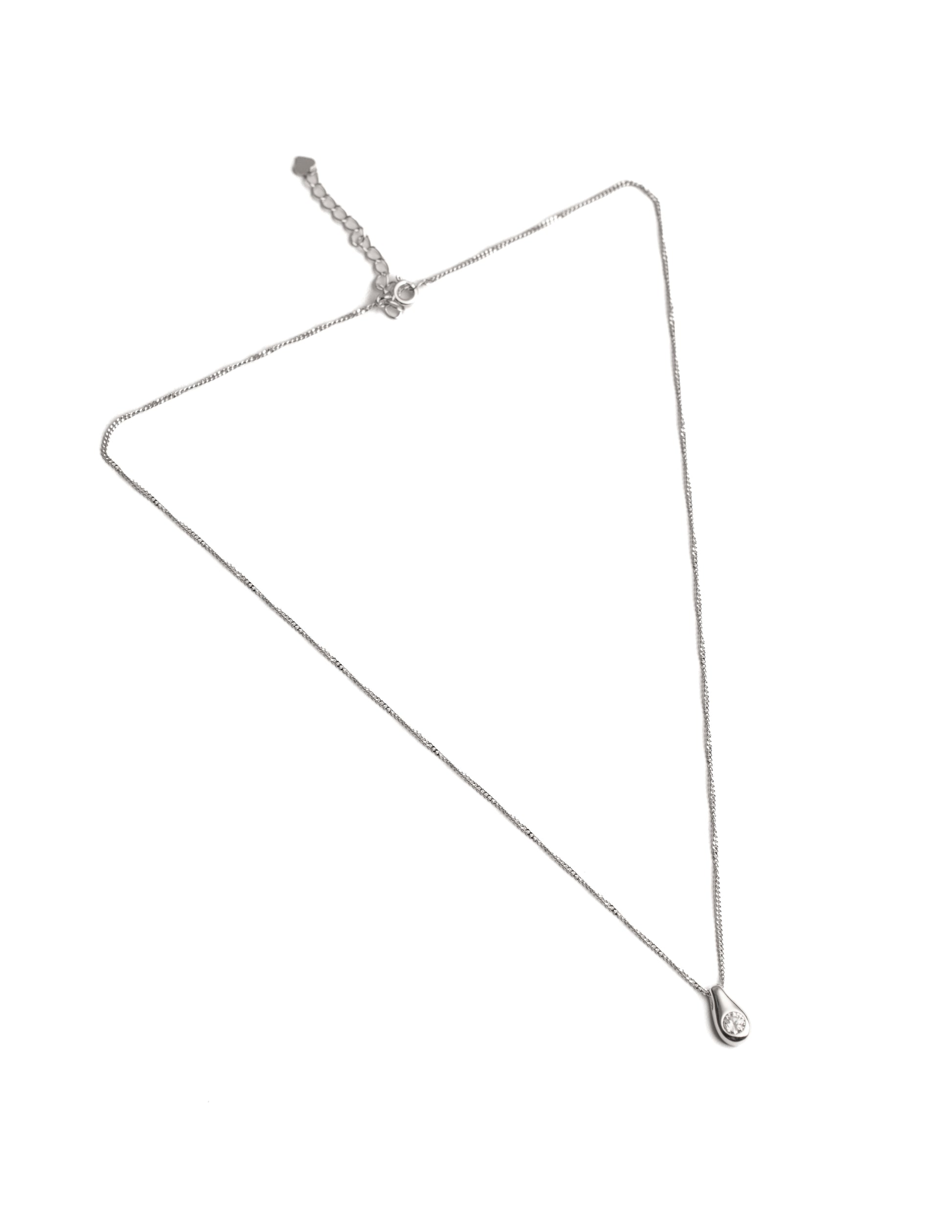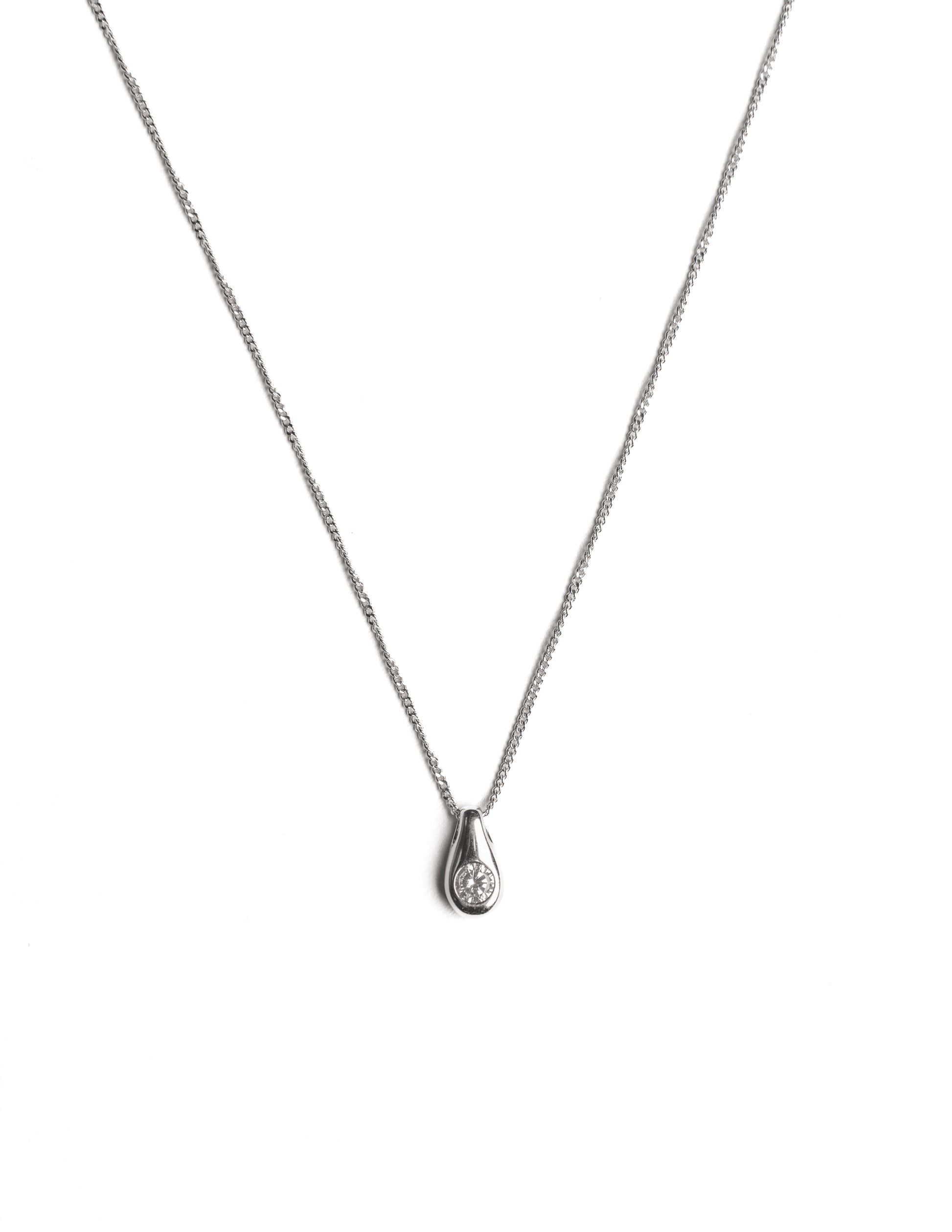 A single bright zircon gemstone set in a smooth silver teardrop. Effortlessly minimal and quietly radiant, like a snowflake captured just before it melts.