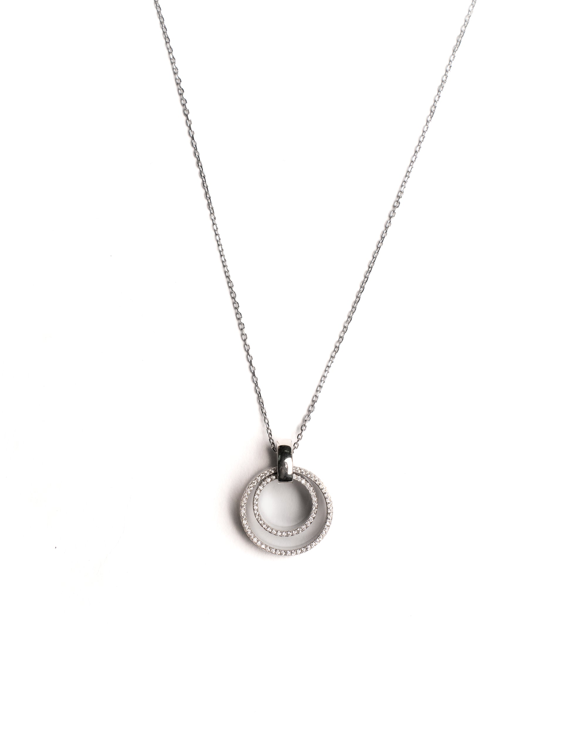 Interlocking circles that catch the light quietly. Minimal silver with delicate pavé detailing.