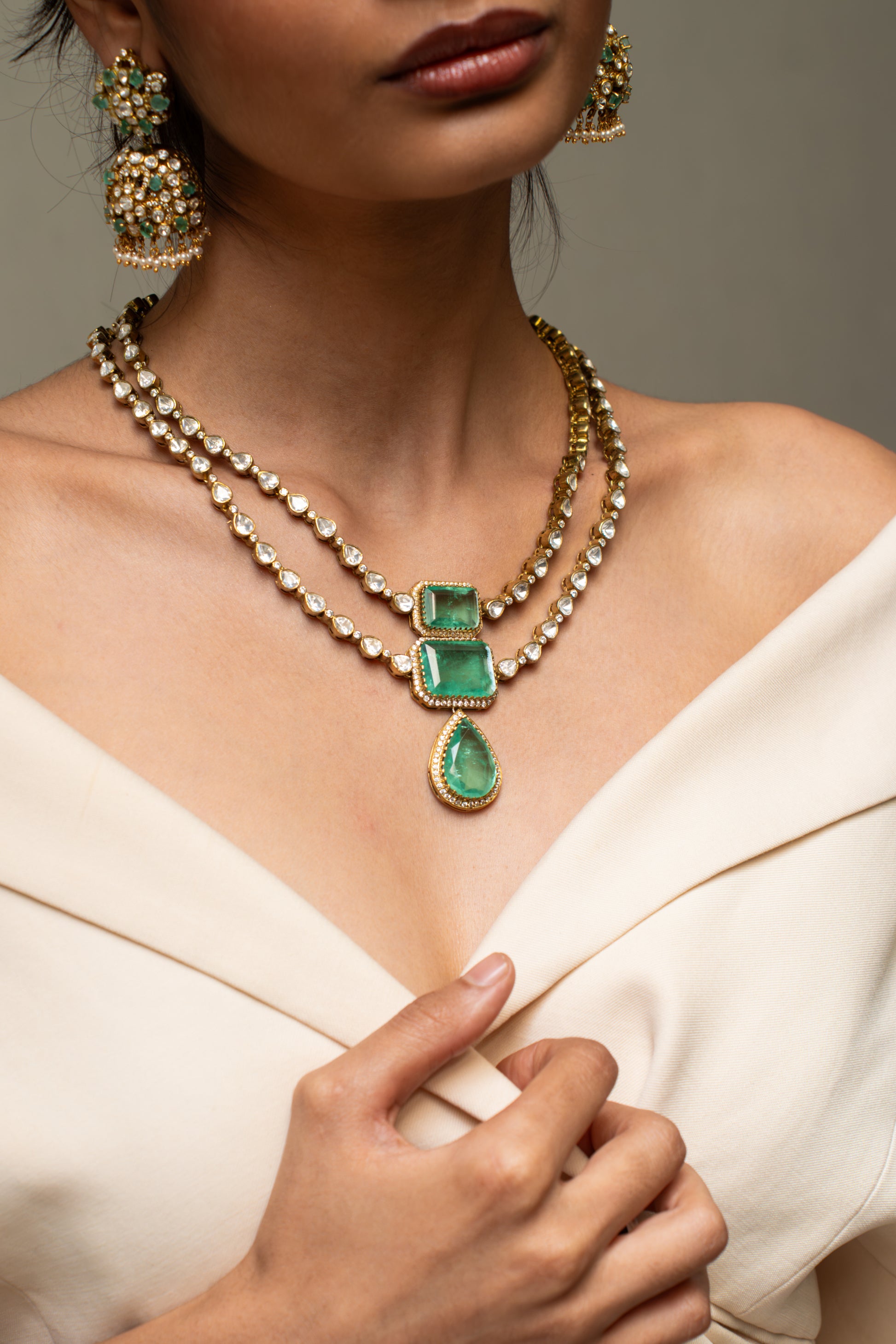 Two strands of luminous kundan-polki framed with vibrant green gemstones. Victorian symmetry reimagined for the modern bride. Layered, luxurious, unforgettable